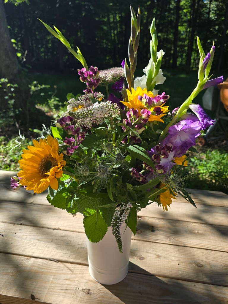 JUNE is a riot of summer color and filled with the hum of bees and butterflies. We’ve got roses, French lavender, lilies, Queen Anne’s lace, cosmos, echinacea, rudbeckia, feverfew, sunflowers, gladiolus, sedum, zinnias, and so many other blooms just flaunting their stuff. Edible flowers and herbs are at their peak.